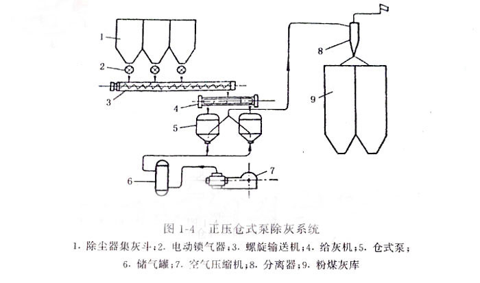 圖1—4是常用的正壓倉式泵除灰系統(tǒng),在此系統(tǒng)中,從干式除塵器分離下的灰,經電動鎖氣器、螺旋輸送機和給灰機進入倉式泵、用壓縮空氣將灰吹送。