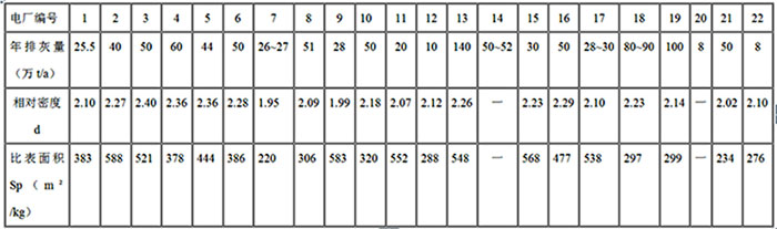 表1-4是長江中下游及大連部分電廠(其中上海附近電廠8家,南京附近電廠7家,長江中游沿岸電廠3家,大連附近電廠4家,共22家)粉煤灰試樣的相對密度和比表面積。